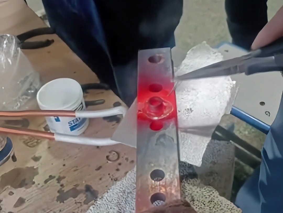 將直徑為1.2mm的銅包鋼絲通過超高頻加熱機的感應(yīng)線圈。